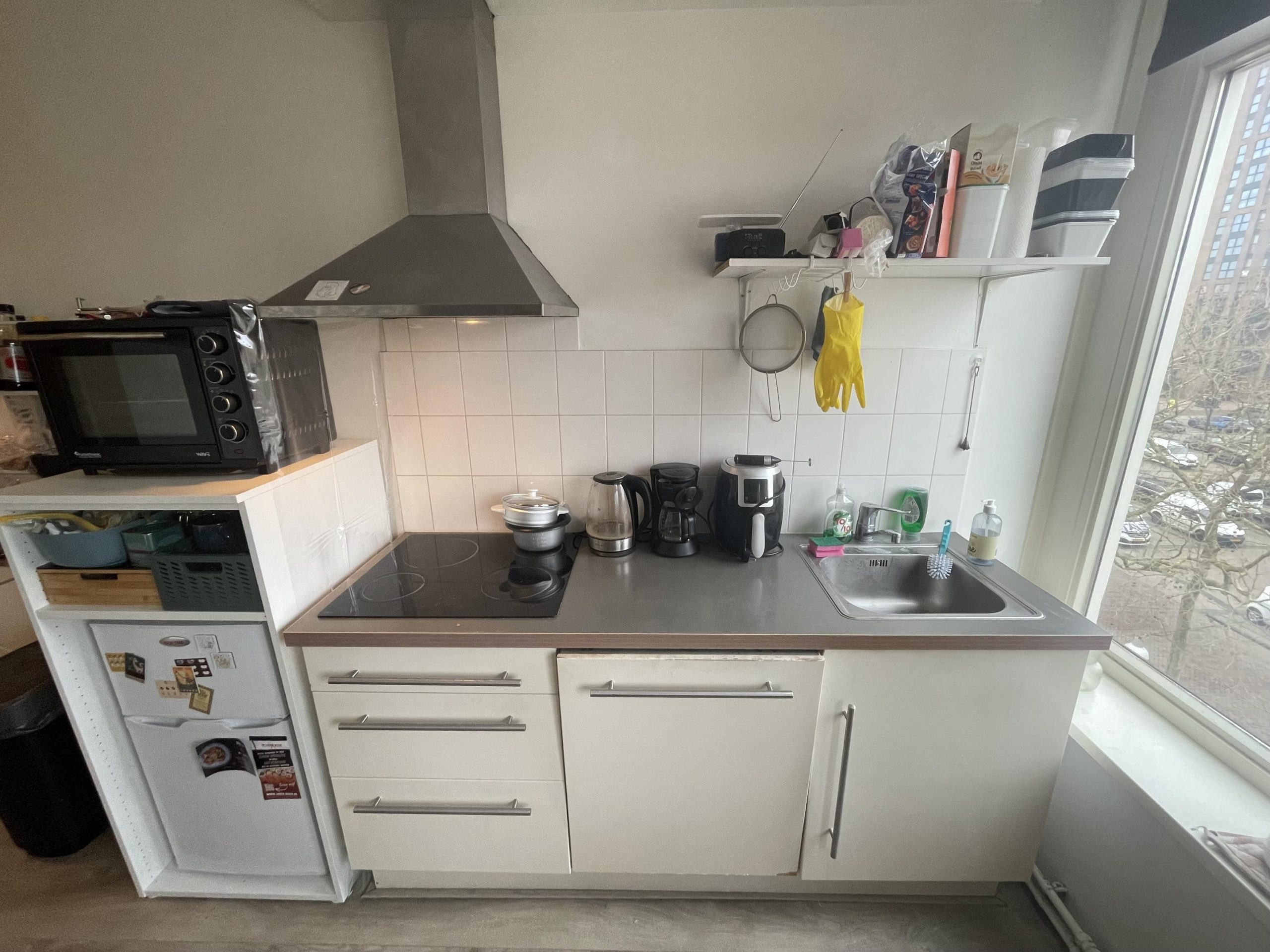 Indeling: Gezamenlijke entree met trapopgang en lift. 3e etage: entree naar ruime en lichte woonkamer met open keuken. Keuken v.v. inductie kookplaat met rvs afzuigschouw en ingebouwd vaatwasser. Badkamer met douche, toilet, wastafel en witgoedaansluitingen. Let op: in deze studio mogen geen huisdieren worden gehouden.
